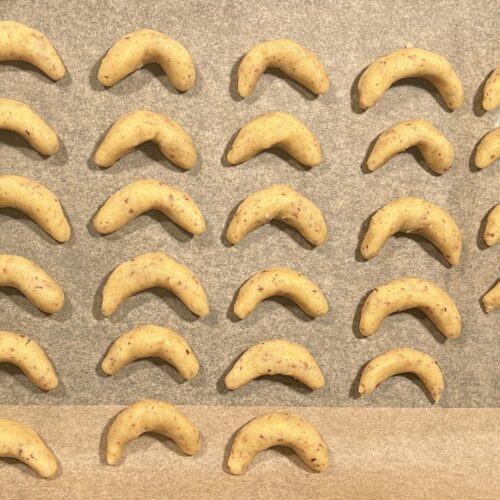 Heize den Backofen auf 190° Ober- und Unterhitze vor. Portioniere dir den kühlen Teig und forme ihn zu Rollen ca. 3 cm dick. Schneide dir immer wieder ca. 5 mm dicke Stückchen runter und rolle sie und forme sie anschließend zu kleinen Hörnchen.